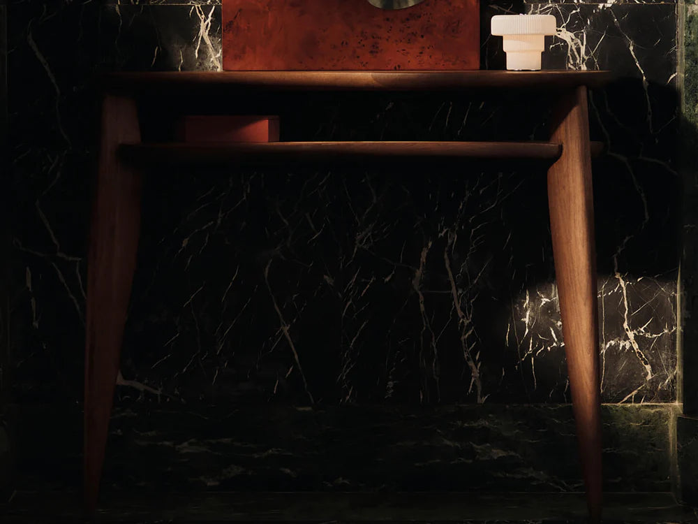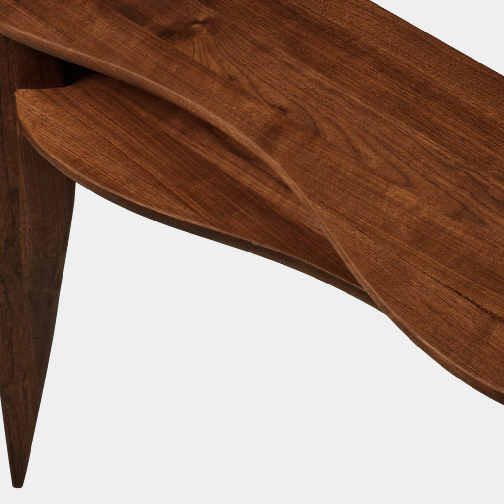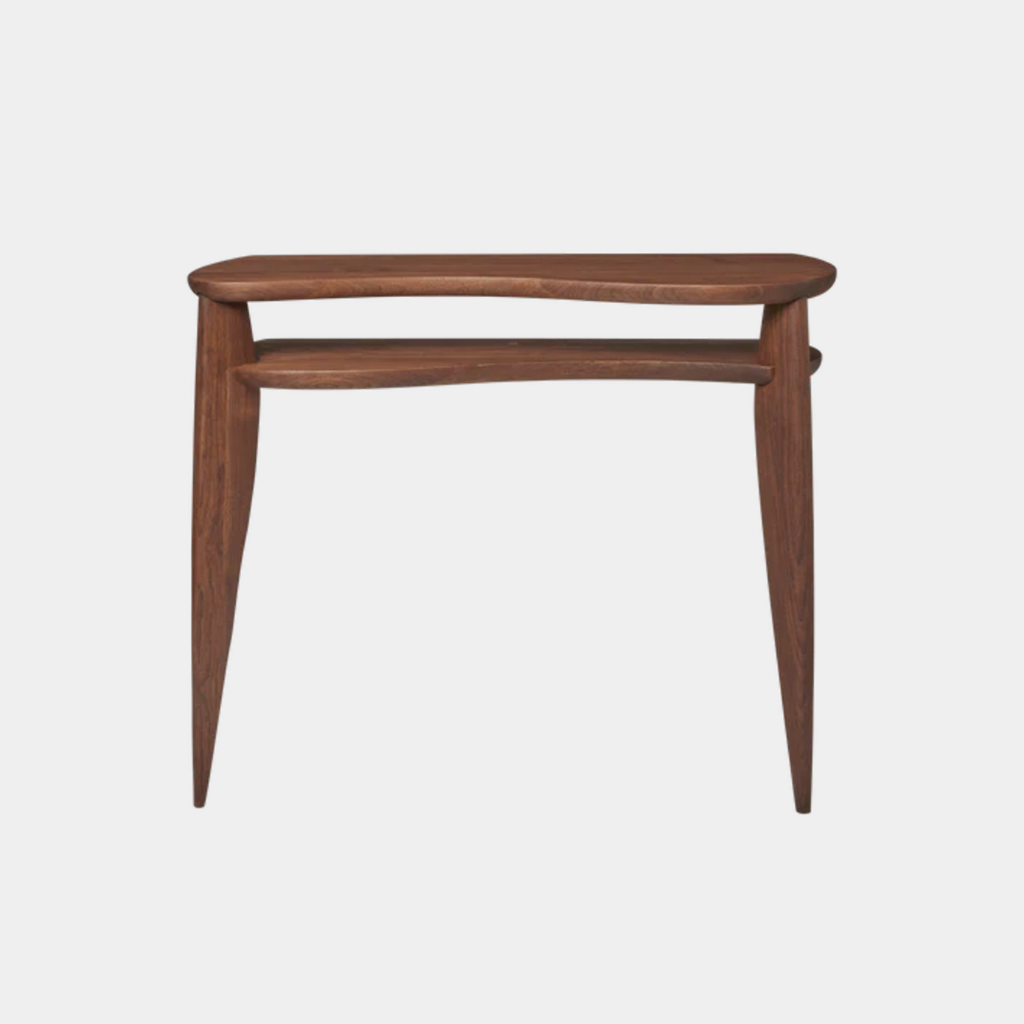 The Feve Console Table is crafted from FSC™-certified solid European walnut. A natural extension of the Feve Family, its soft, curved lines and warm finish lend a refined sense of lightness, while two gently rounded shelves offer practical display and storage. Ideal for entryways, hallways, or compact living spaces, it brings warmth, character, and subtle sculpture to everyday environments.