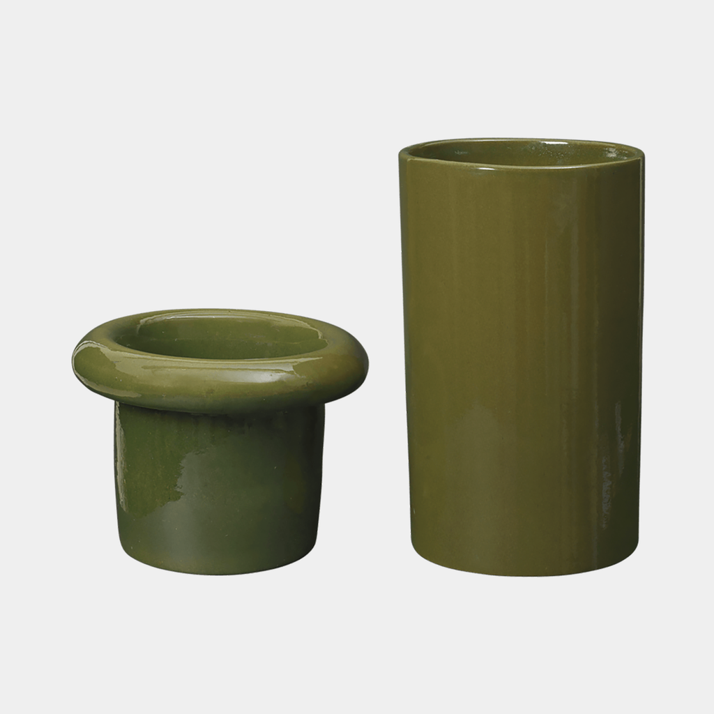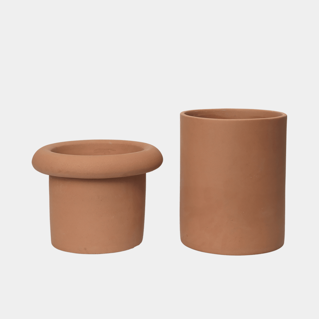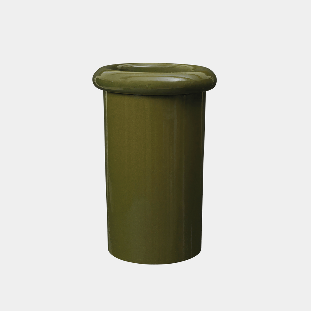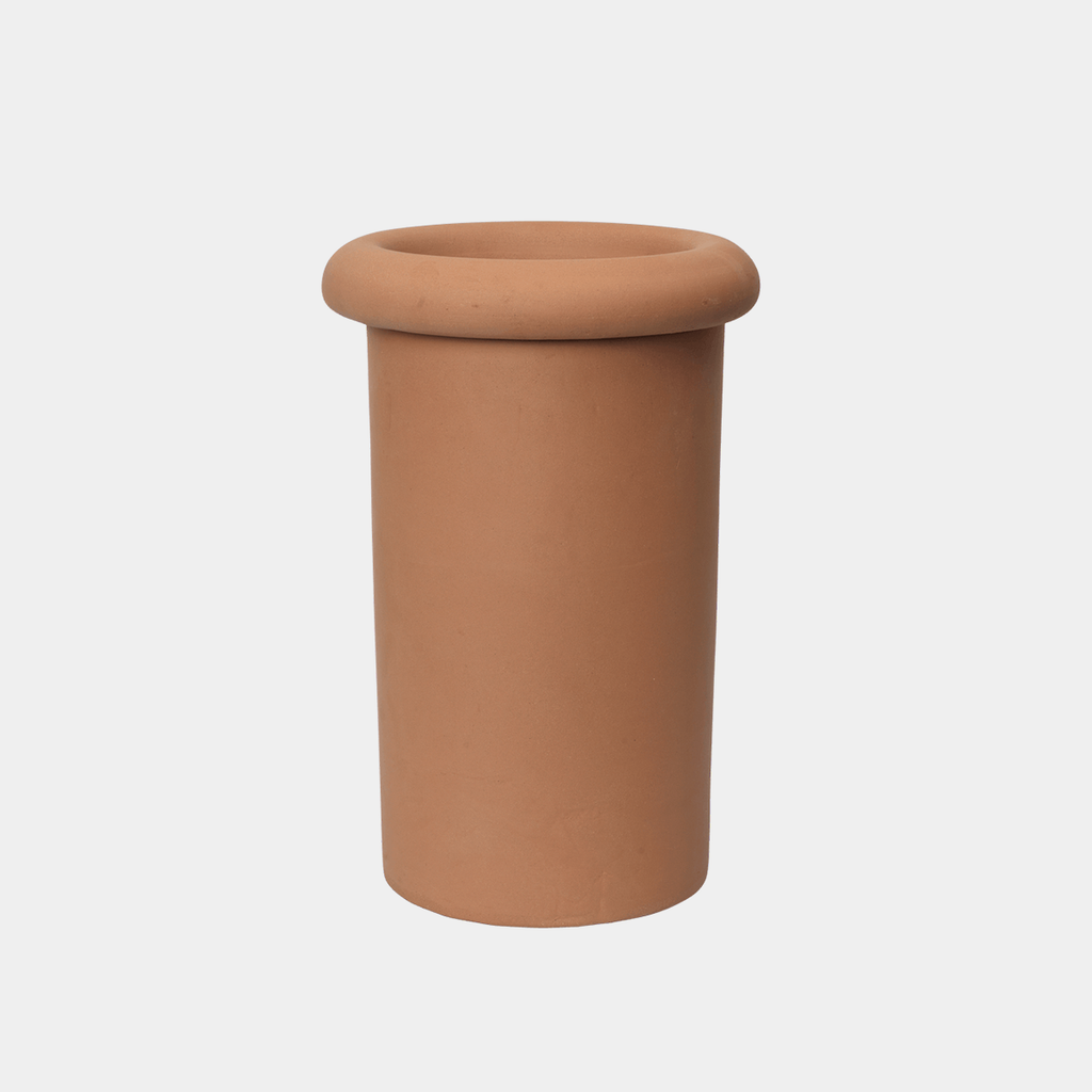 The Rollo Pot introduces a graphic, architectural approach to planting. Its slim cylindrical form is defined by a pronounced rim, while the elevated saucer extends the silhouette vertically, giving the piece a more sculptural presence.