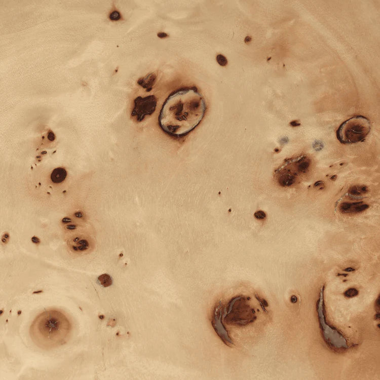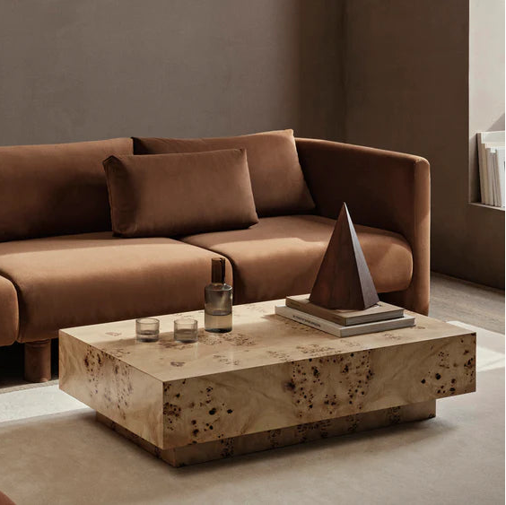Rooted in warm geometry, the Burl Coffee Table anchors a room with its low, monolithic profile and the organic movement of poplar burl. Swirls, knots, and eyes in the veneer create natural patterning that shifts with the light, bringing quiet drama to lounge seating. Crafted from FSC™-certified poplar burl veneer over a sturdy MDF core, the piece balances bold, brutalist lines with an inviting, tactile surface. Sized generously for books, trays, and everyday rituals, it’s a statement that still plays beautifully with surrounding textures.