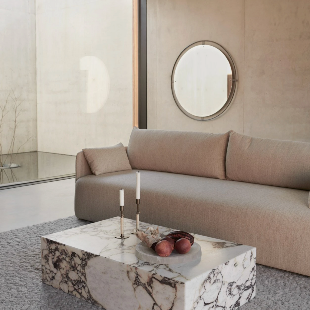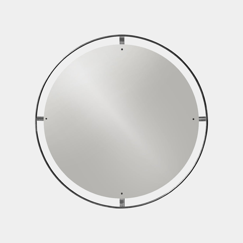 Encircled by a halo-like ring in bronzed or polished brass, the Nimbus Mirror appears to float from the wall. The decorative screws securing the frame add a subtle architectural note, while the mirror’s generous scale enhances the sense of openness in any interior. Referencing its mythological namesake — the luminous cloud said to surround deities — Nimbus captures both function and quiet grandeur in a single composition.