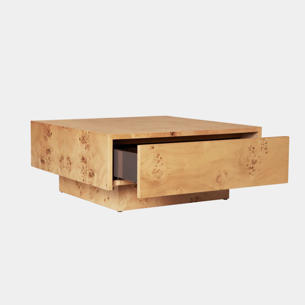 The Burl Storage Coffee Table features a square format with a discreet storage drawer. Crafted from FSC™ Mix-certified wood with a richly grained burl veneer, its swirling surface pattern adds depth and visual warmth. The concealed drawer offers a practical space for storing everyday items, keeping your living area calm and uncluttered.