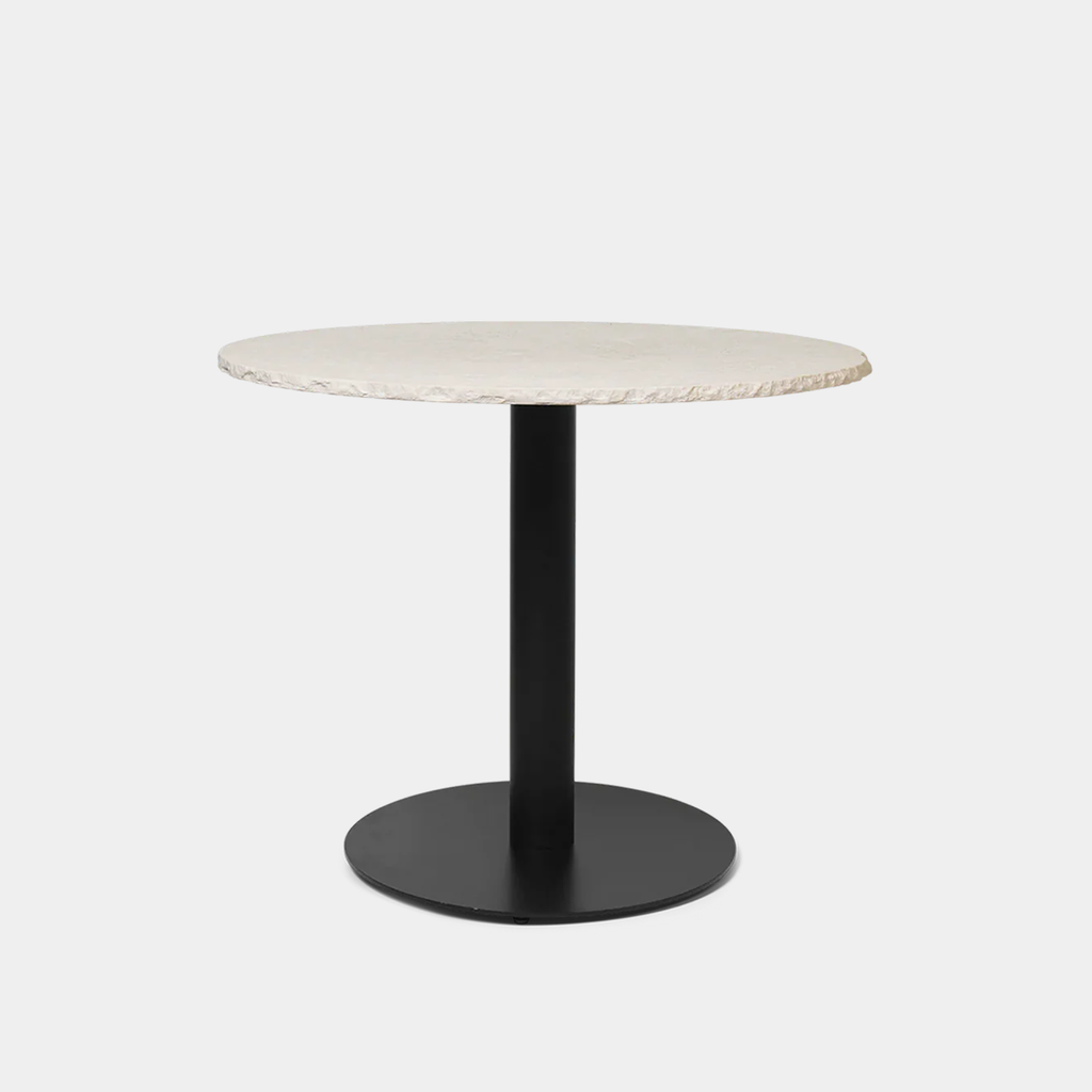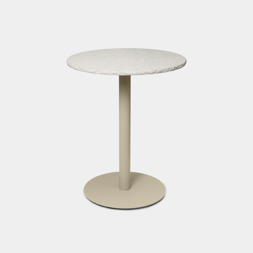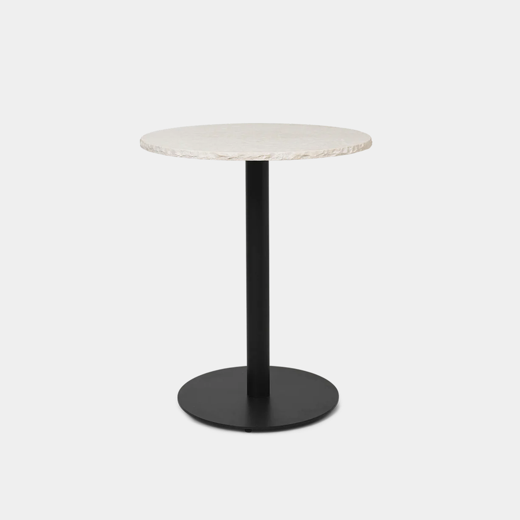 Materials — Tabletop: Brushed Bianco Curia marble. Base: Powder-coated galvanized steel