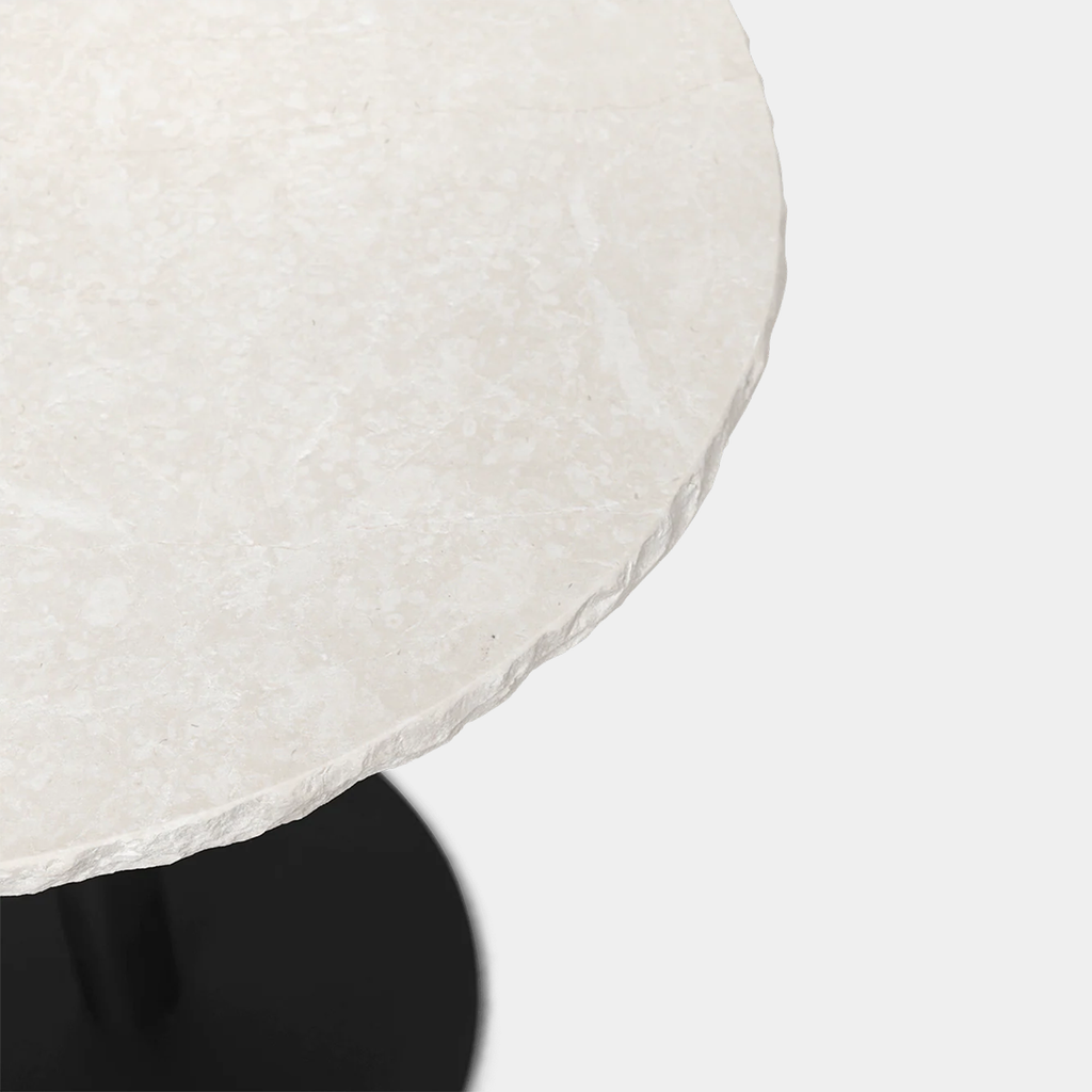The Mineral Café Table is designed for compact living while offering refined material presence. Crafted from Bianco Curia marble, each tabletop features hand-chiseled broken edges that create a one-of-a-kind sculptural form. A subtle surface treatment enhances durability while preserving the stone’s natural character, allowing the marble to remain the focal point of this timeless design.