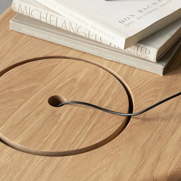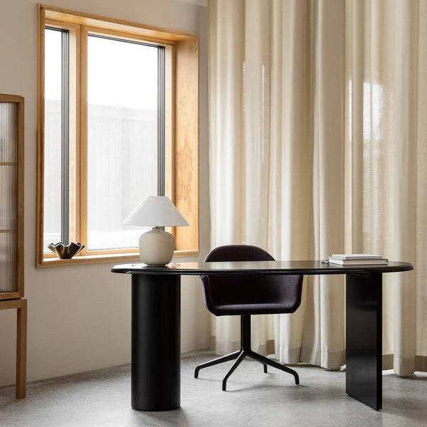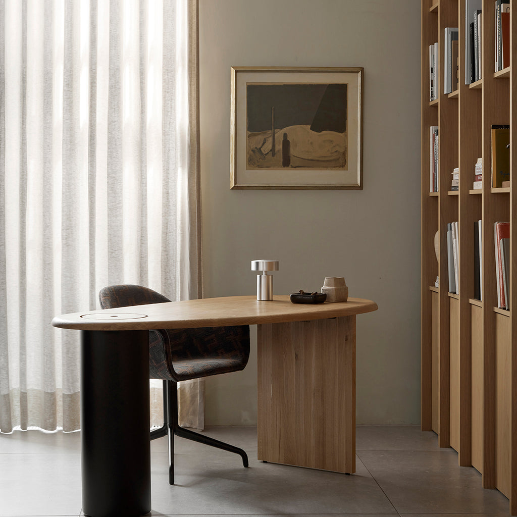 Designed by Fred Rigby for Audo Copenhagen, the Eclipse Desk celebrates materiality and form. Its distinctive, asymmetrical silhouette—defined by gentle concave and convex curves—recalls the quiet drama of an eclipse, inviting touch and close inspection. Crafted in solid oak with a contrasting, powder-coated steel leg, the tabletop features a circular lid that lifts to reveal hidden storage within the supportive steel column, keeping essentials close at hand and the surface clear. Equally compelling placed centered in a room or positioned against a wall, Eclipse brings sculptural presence and calm order to the modern workspace.