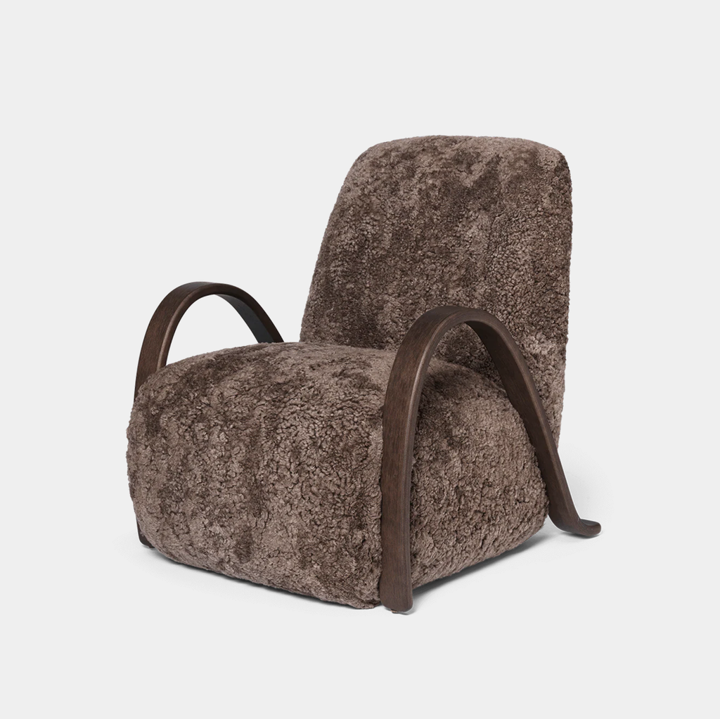 Fabric — Sheepskin Curly 17 mm by Skandilock. Seat/backrest: Wooden structure with high resilience PU foam and polyester wadding. Armrests: Dark stained oak veneer. FSC™ Mix-certified wood