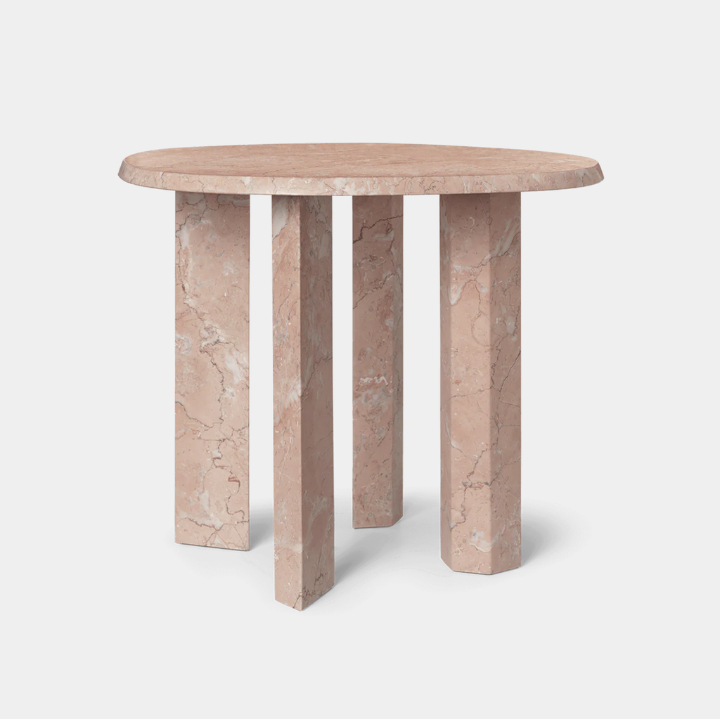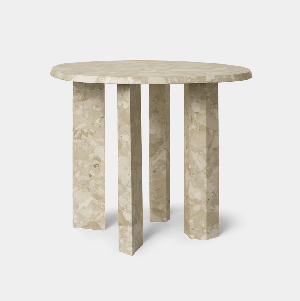 The Taula Side Table is named after the iconic megalithic stone structures of the Balearic Islands, translating ancient architectural presence into a refined contemporary form. Crafted entirely from marble, its smooth, rounded top is contrasted by a beveled edge and supported by four broad, linear legs.