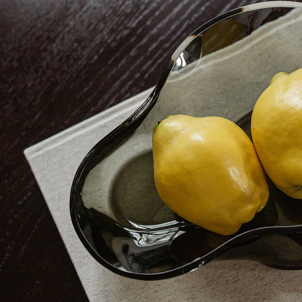 Taking its cues from the spiraling movement of air, the undulating Aer Bowl in smoke colored glass brings sculptural appeal to surfaces—whether filled with treats or placed on a surface as a decorative object.