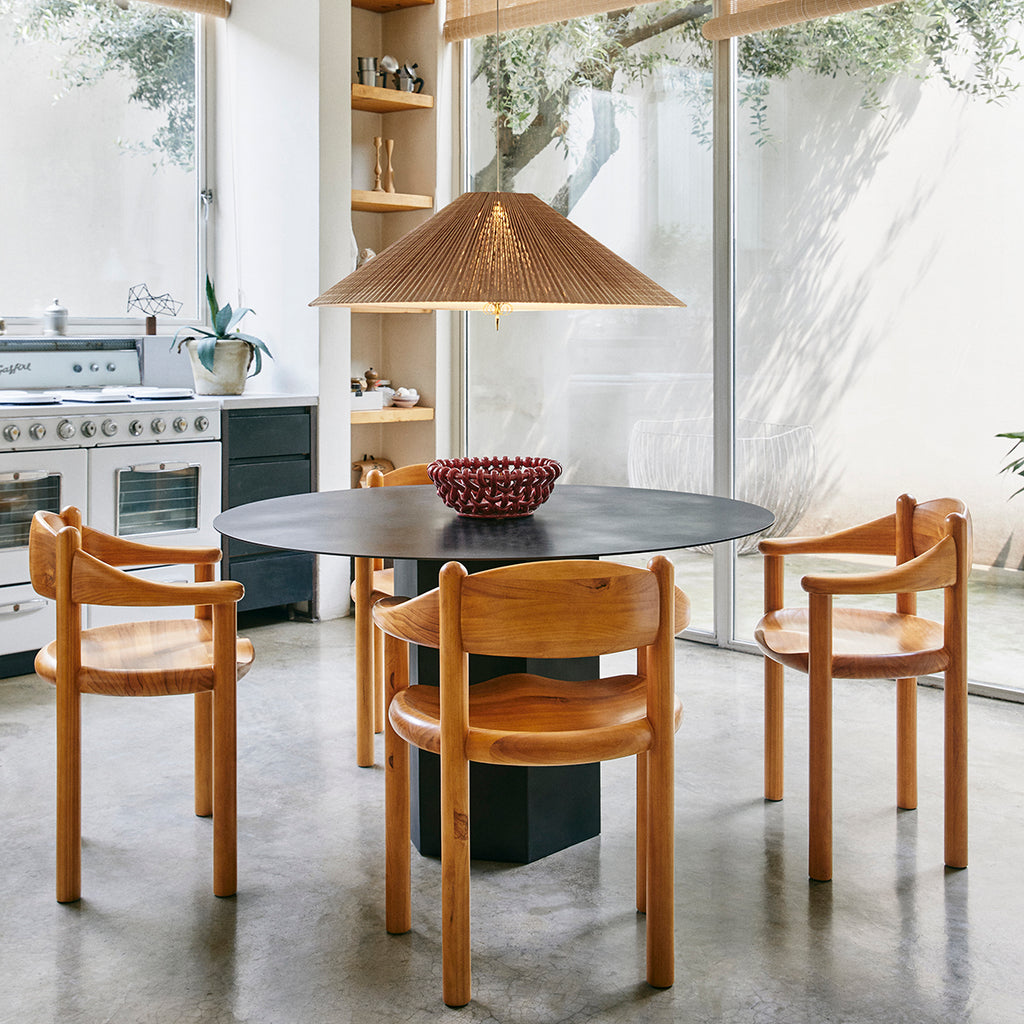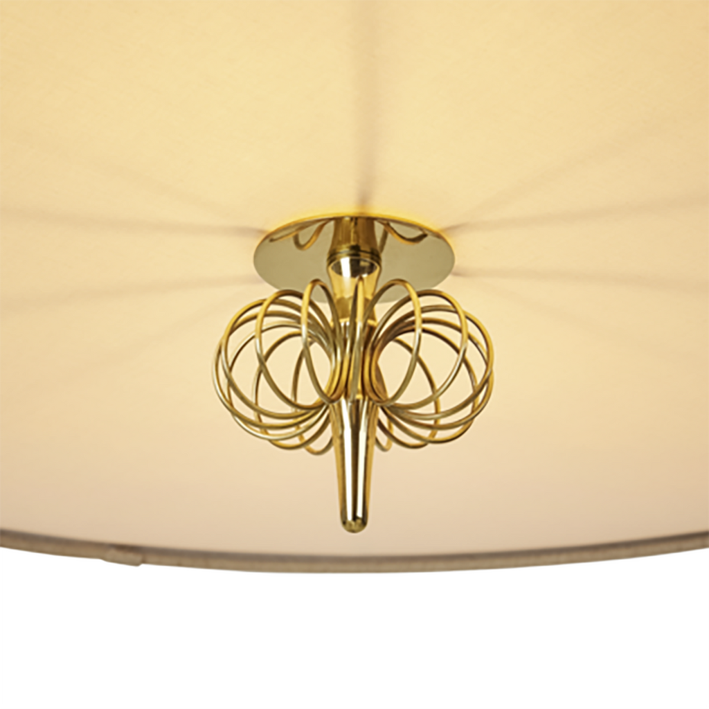 Designed in 1972 by the legendary Finnish lighting designer Paavo Tynell, this pendant exemplifies his refined craftsmanship and sensitivity to material. Each conical shade is made from hand-sewn bamboo slats, joined with a linen liner and mounted on a wire frame to create a soft interplay of light and shadow. The light radiates both downward and through the natural fibers, producing a warm, ambient glow. Tynell’s signature brass detailing lends a timeless accent, while the fabric diffuser and decorative brass finial complete the composition with elegant restraint.