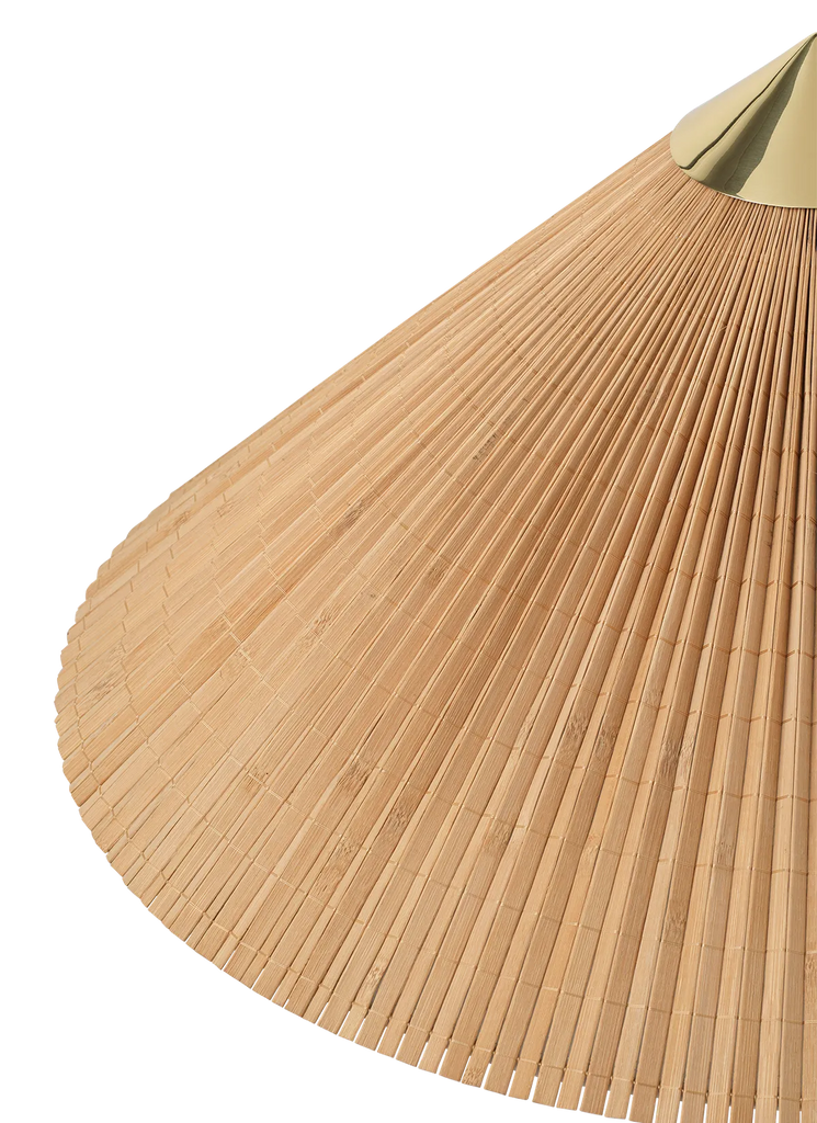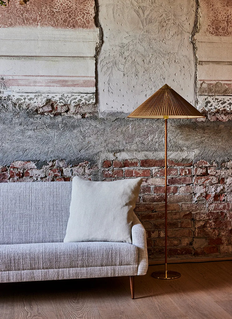 Originally designed by Finnish designer Paavo Tynell in 1935 for the Hotel Aulanko, the 9602 Floor Lamp—often referred to as the “Chinese Hat”—embodies Tynell’s graceful blend of craftsmanship and lightness. Its wide, flared shade and rattan-wrapped stem create a composition that feels both sculptural and serene.