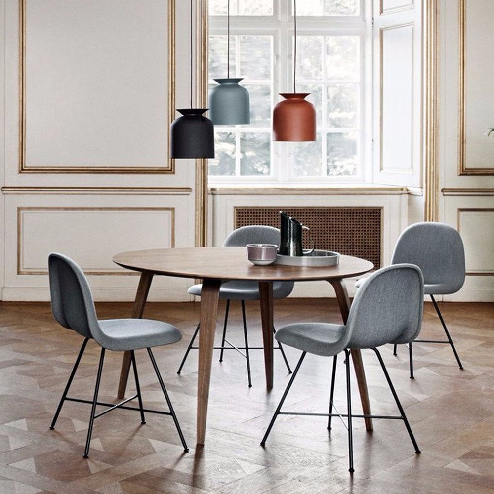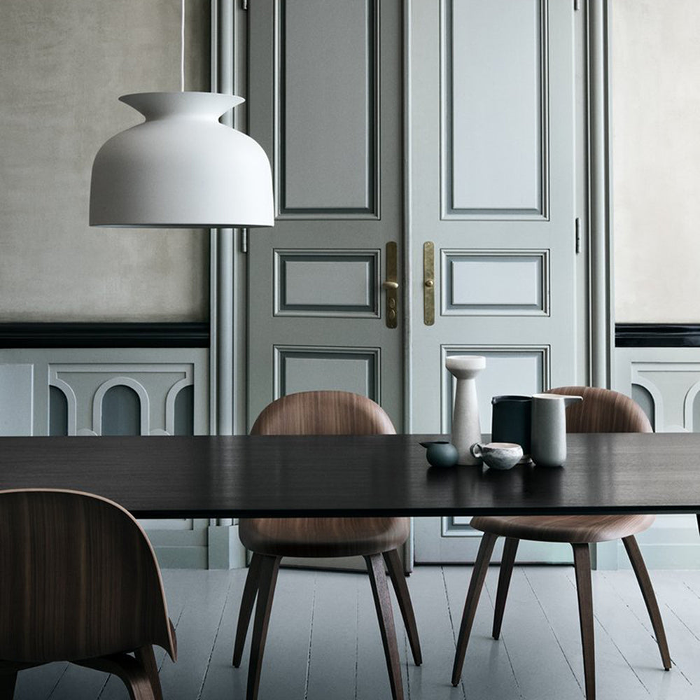 The Ronde Pendant by GUBI blends industrial character with soft, contemporary form. Its bell-shaped silhouette recalls classic mid-century lighting while remaining distinctly modern. Available in two sizes and a refined matte palette, the pendant complements both residential and professional interiors.