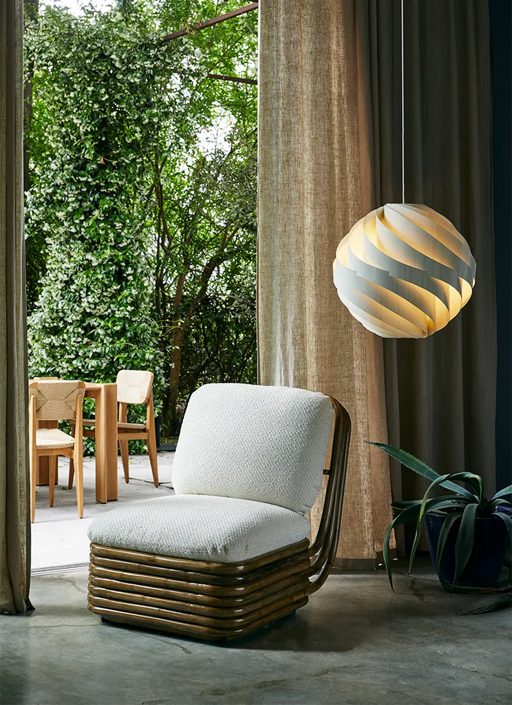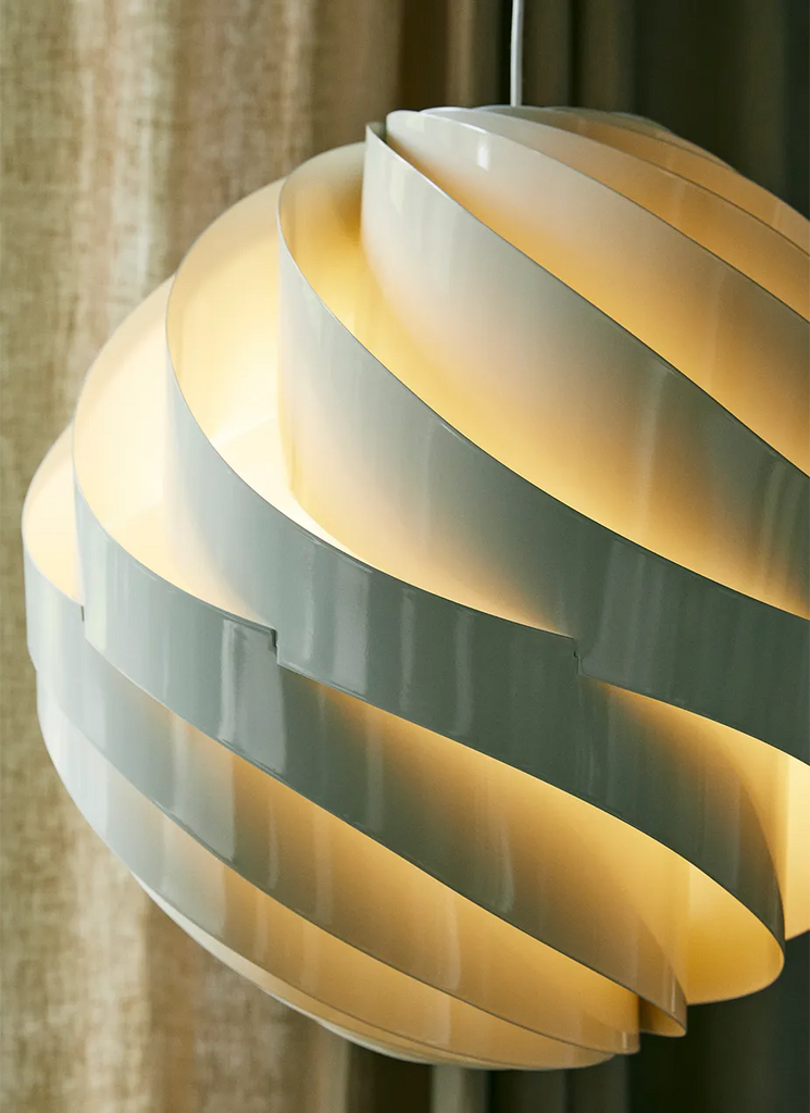 Originally designed in 1965 by Louis Weisdorf and first produced in 1967, the Turbo Pendant exemplifies sculptural simplicity and structural complexity in perfect harmony. Inspired by the lightness of Japanese rice paper, Weisdorf reinterpreted the form in durable aluminum, creating twelve spiral lamellae that unite into a flower-like globe. The result is a pendant that feels both airy and strong, casting an even, diffused light while celebrating the designer’s fascination with repeated geometric forms.