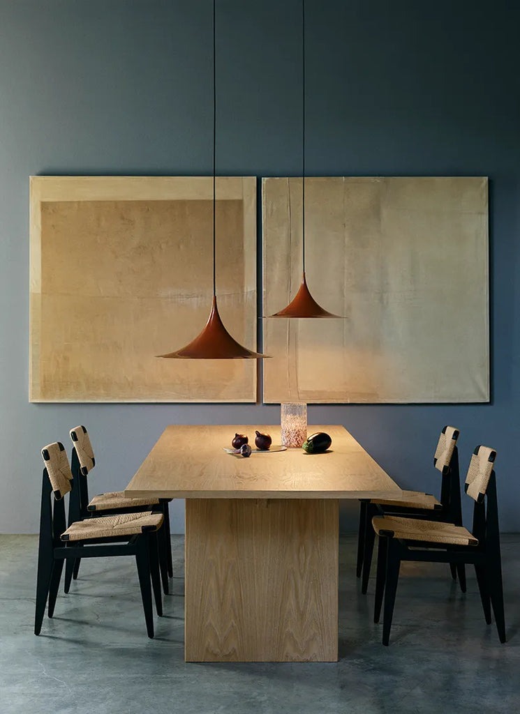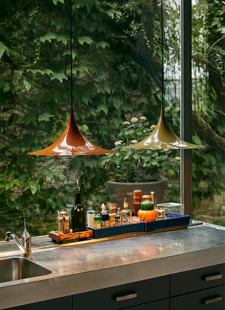 Semi is a unique pendant lamp, based on two quarter-circles put together, back-to-back. With its its distinctive arch-shaped, enamelled metal shade, lightness of form and unique, timeless design, the elegant Semi lamp achieved great success in the 1980's and became, at that time, the best-selling Danish design, gaining worldwide recognition and iconic status.