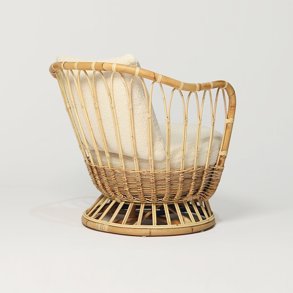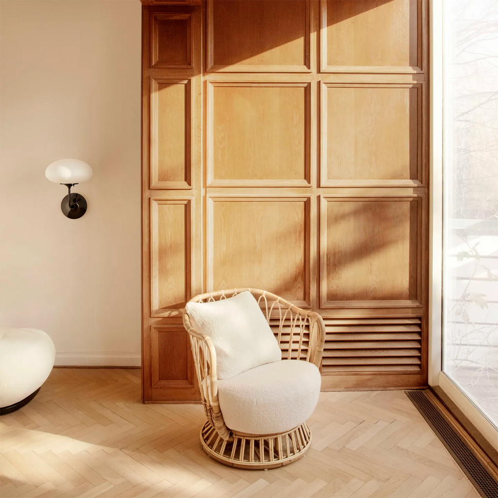 The Grace Chair by Tove Kindt-Larsen is a sculptural study in soft curves and natural materiality, designed in 1936 and revived as part of GUBI’s celebration of rattan craftsmanship. Inspired by the pebbles and driftwood of northern Denmark, the frame’s sweeping lines and intricate rattan loops create a light, open silhouette with an inviting sense of ease.