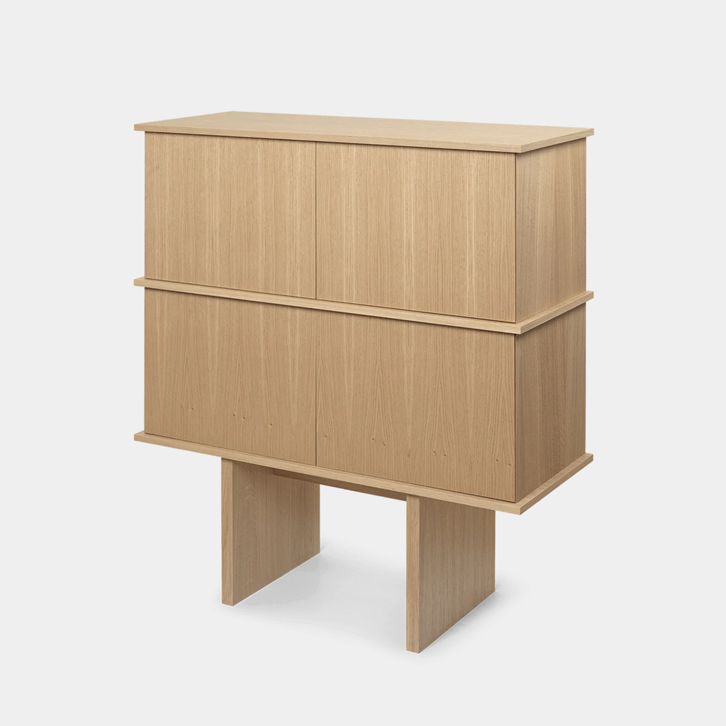 Crafted from FSC™ Mix-certified oak veneer, the Stilt Sideboard balances refined restraint with architectural presence. Inspired by structural pillars that elevate forms above ground, its elongated legs create a light, vertical rhythm while framing generous enclosed storage. The double configuration offers expanded capacity and a striking composition defined by clean wooden divisions. For a more streamlined expression of the design, explore the Stilt Sideboard Single.