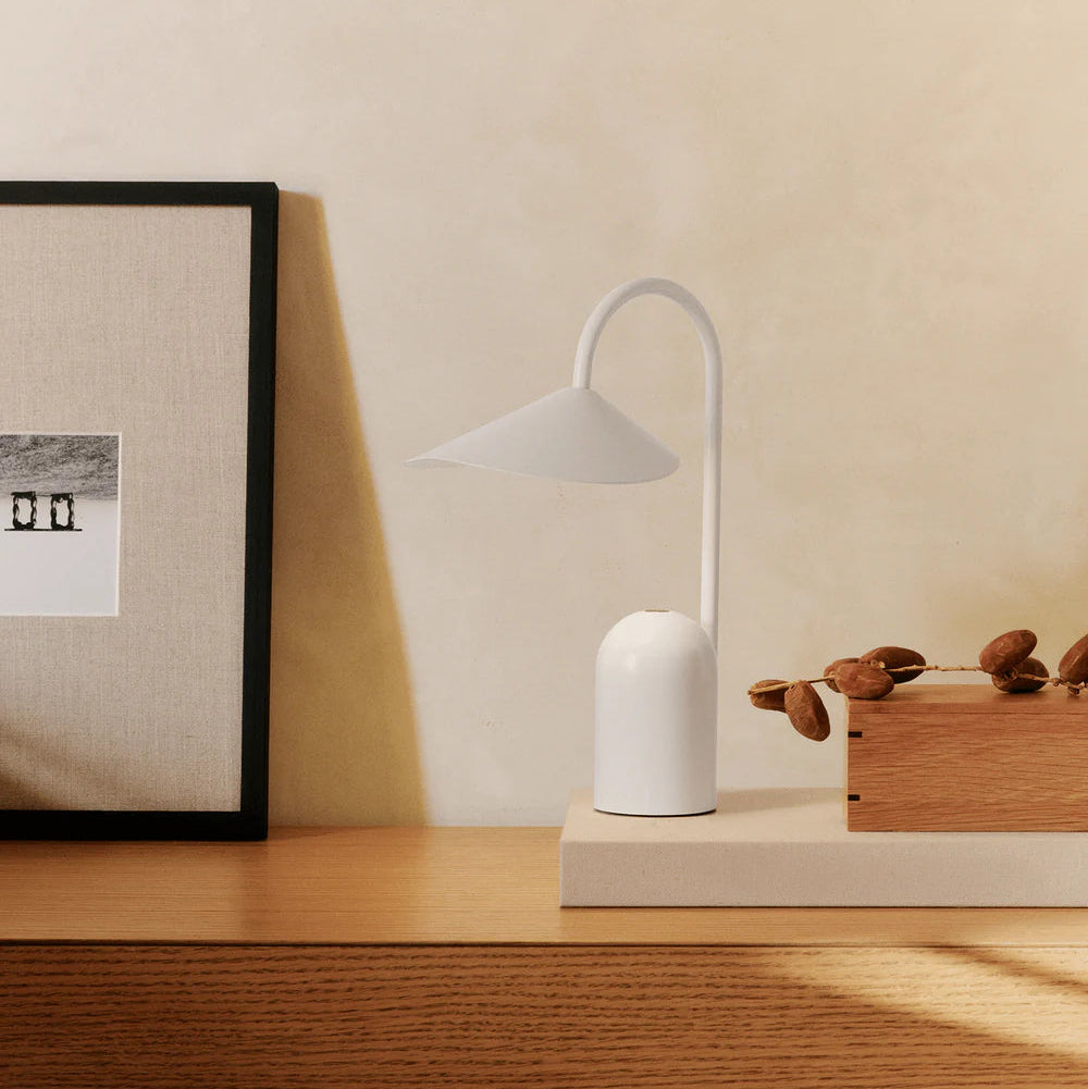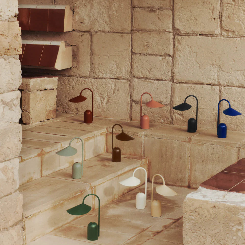 Designed for flexibility and ease, the Arum Portable Lamp brings soft, ambient light to both indoor and outdoor settings. Inspired by the sculptural silhouette of the Arum Table Lamp, this compact version is crafted entirely from powder-coated iron and aluminium for durability and a refined finish. The petal-shaped shade appears to float from the slender stem, creating a sense of visual balance. Rechargeable via USB-C and equipped with a three-step touch dimmer, the lamp offers adjustable illumination wherever it’s placed.