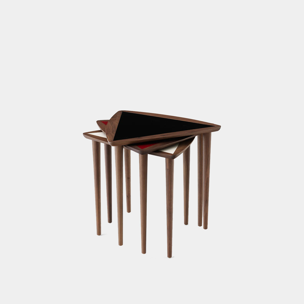 Designed by Arthur Umanoff in the 1950s, the Umanoff Nesting Side Table by Audo Copenhagen embodies the era’s refined approach to functional modernism. A set of three stackable tables crafted from solid walnut with colored laminate tops in sculptural, geometric forms, the design balances warmth and precision. The tables can be nested to save space or arranged individually for versatile use, bringing an effortless mid-century elegance to contemporary interiors.