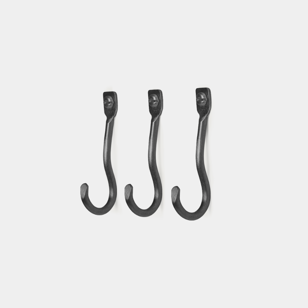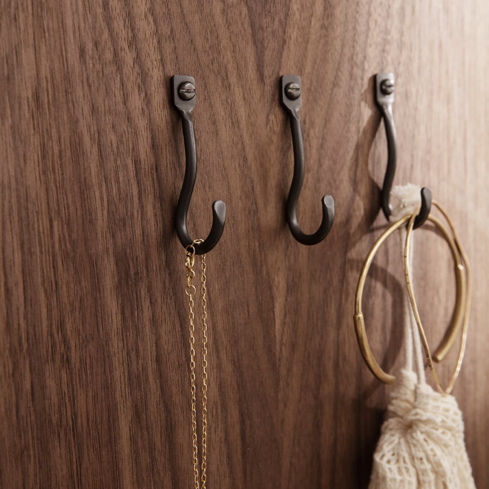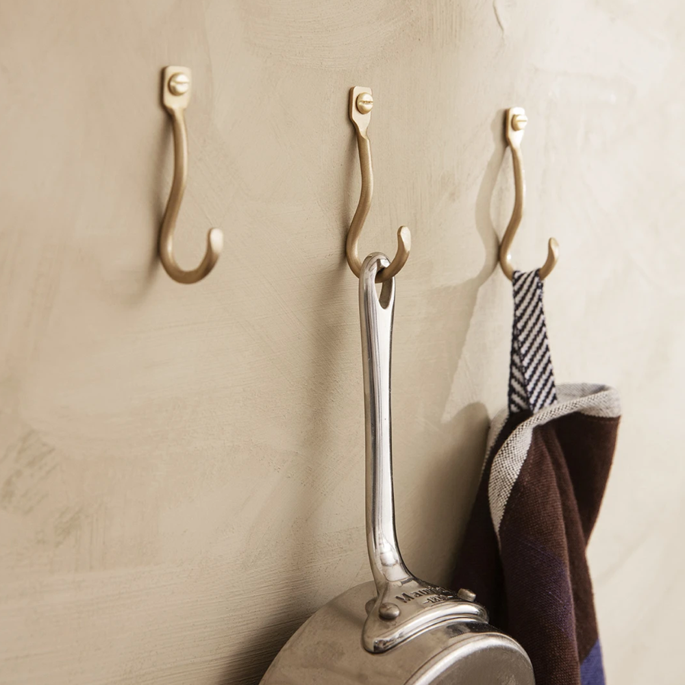 The Curvature Hooks by Ferm Living blend organic form and practical design. Each set includes three hand-formed solid brass hooks, their fluid silhouettes shaped individually to create subtle variations and character. Perfect for entryways, bathrooms, or bedrooms, they bring sculptural warmth to the everyday act of hanging accessories or towels. Offered in natural Brass for a timeless glow or Black Brass for a bold, modern finish, the Curvature Hooks exemplify the artistry and imperfection of handmade design.